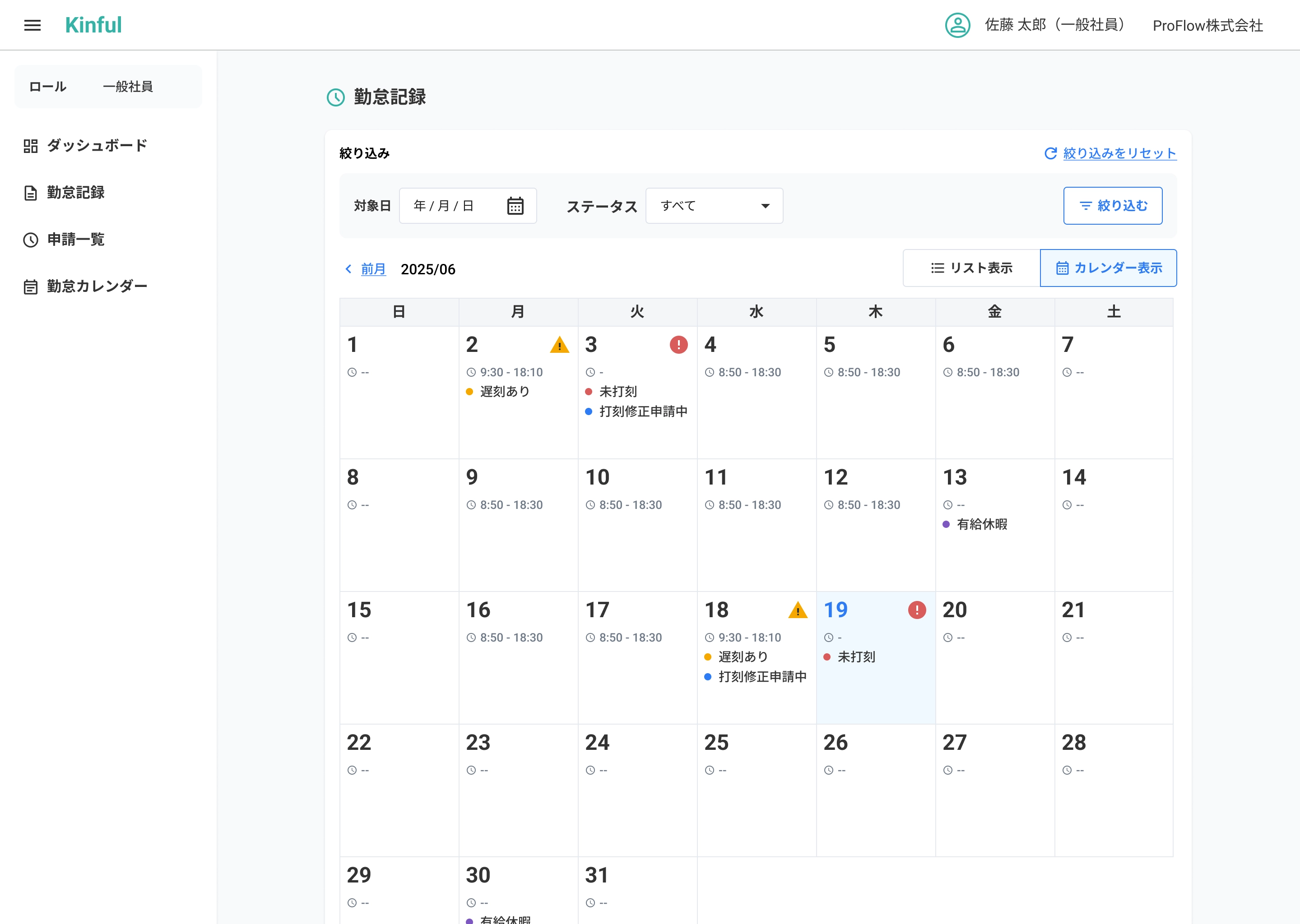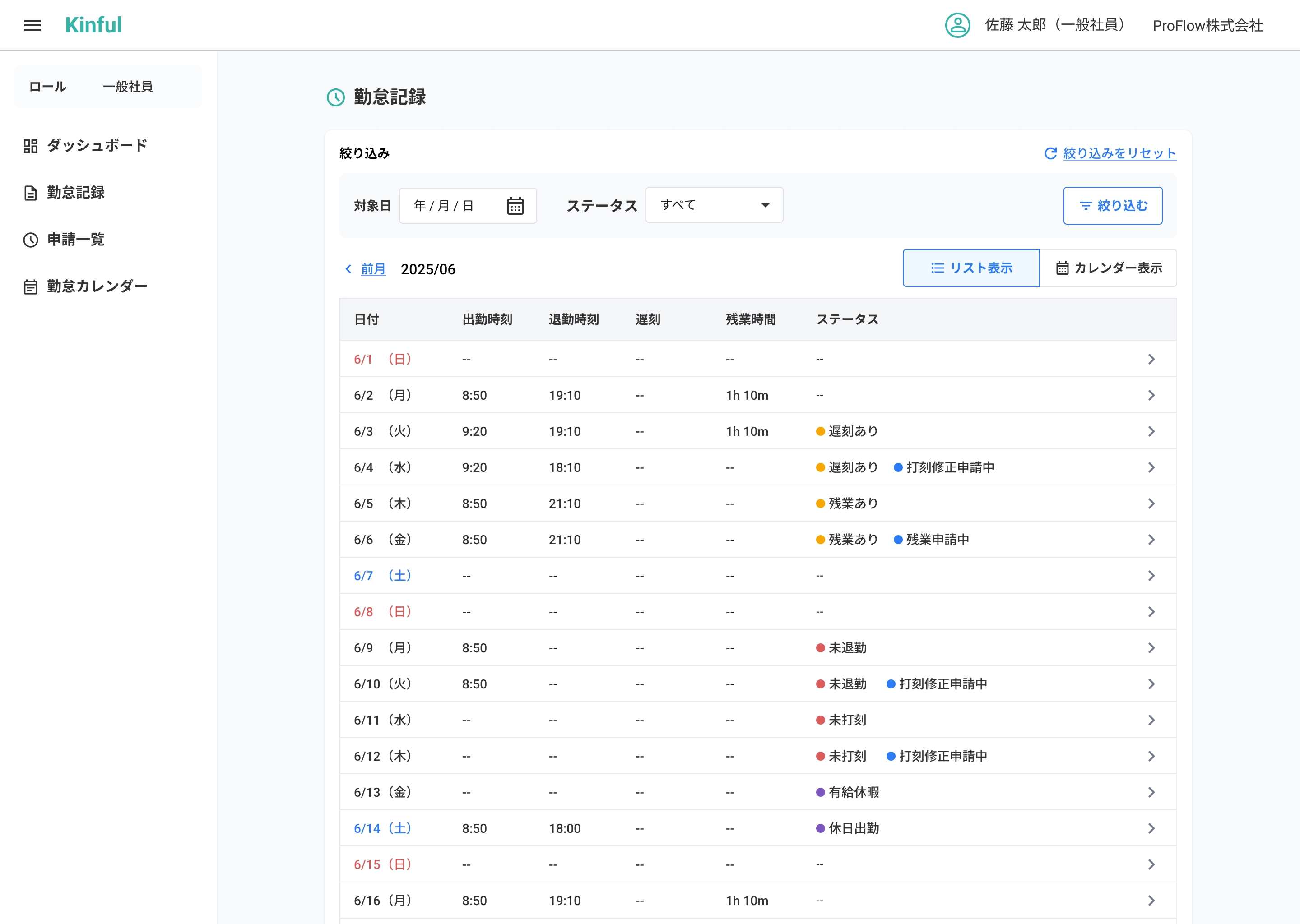 リスト/カレンダーで未打刻・遅刻・申請中をチップとアイコンで表示し、異常日は詳細から該当申請をその場で起票。