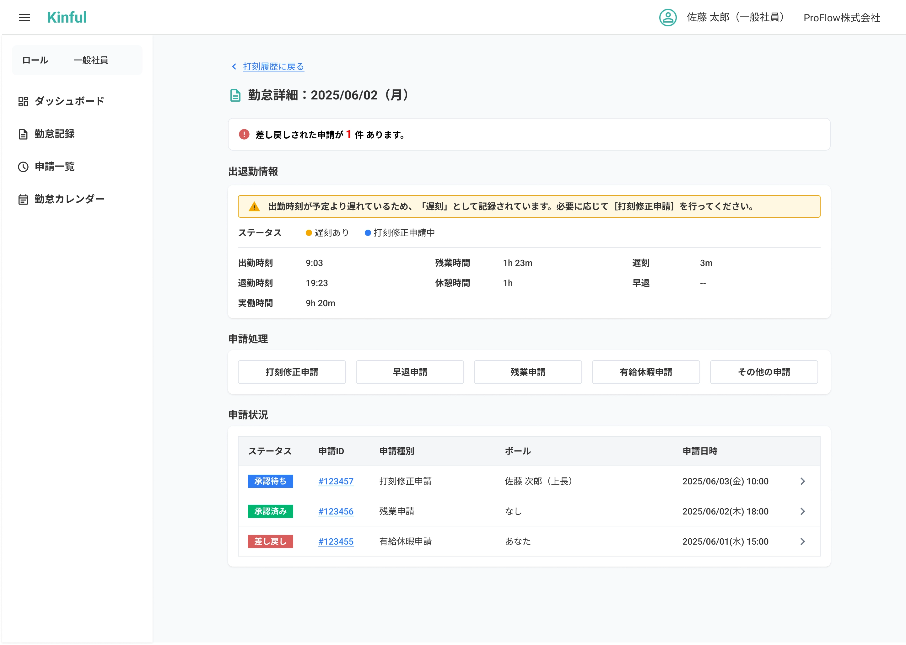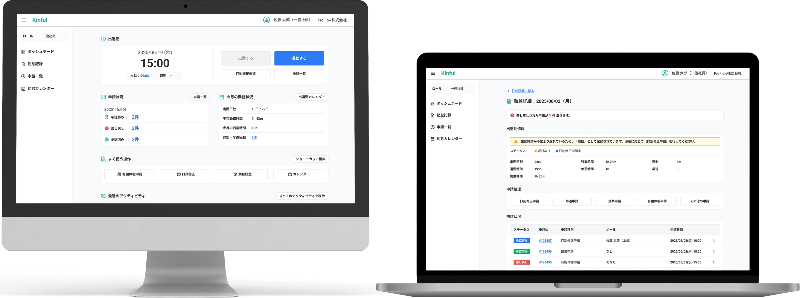 出退勤・申請状況・今月の実績を1画面に集約し、出勤/退勤・打刻修正・申請を最短導線で実行。