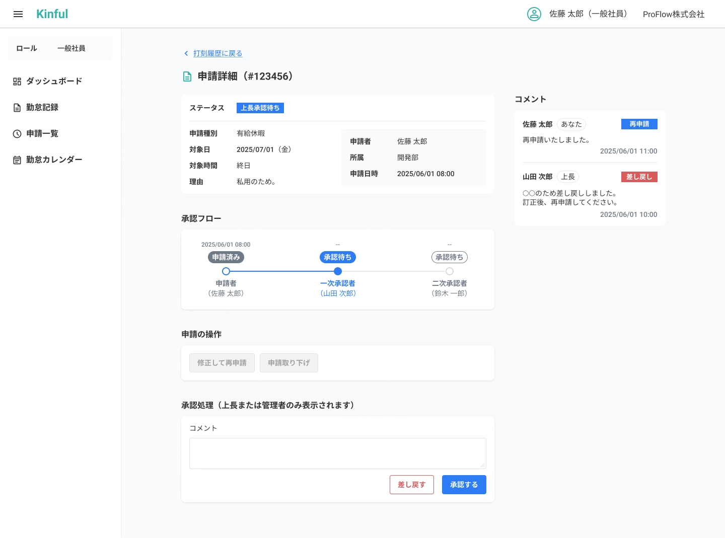 自分の申請の進捗を把握し、必要なアクション(再申請/取消)に即応する。