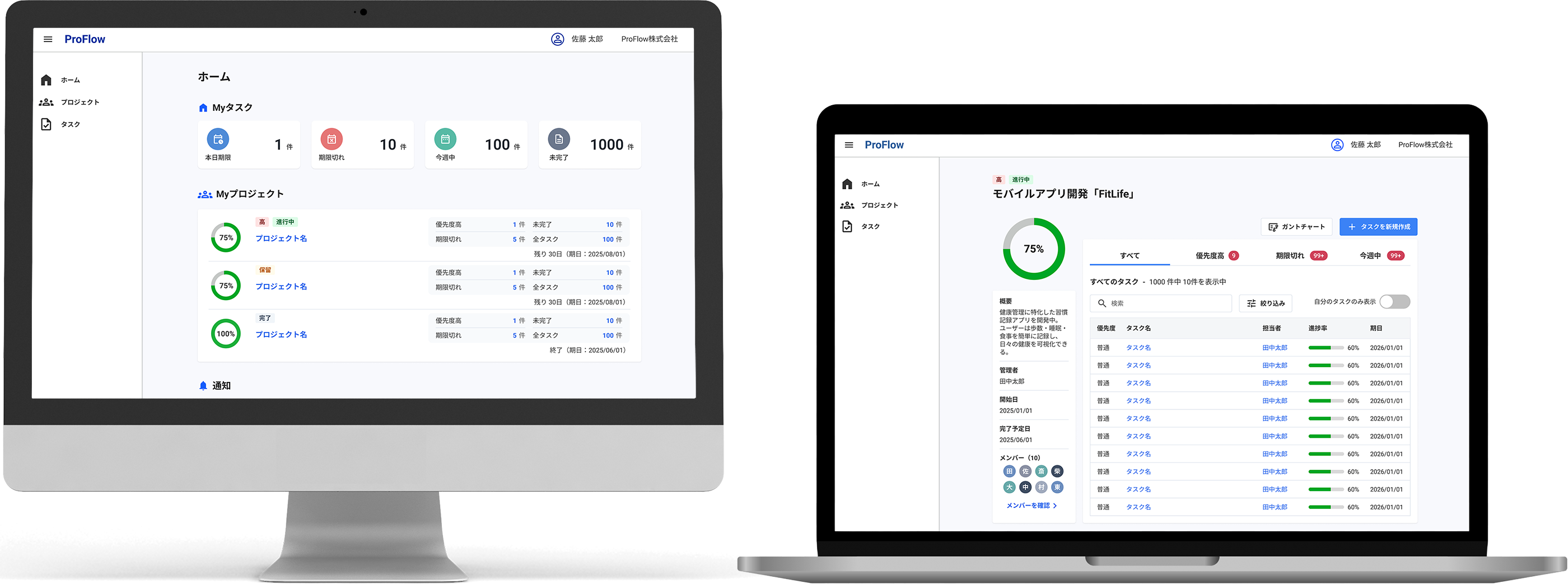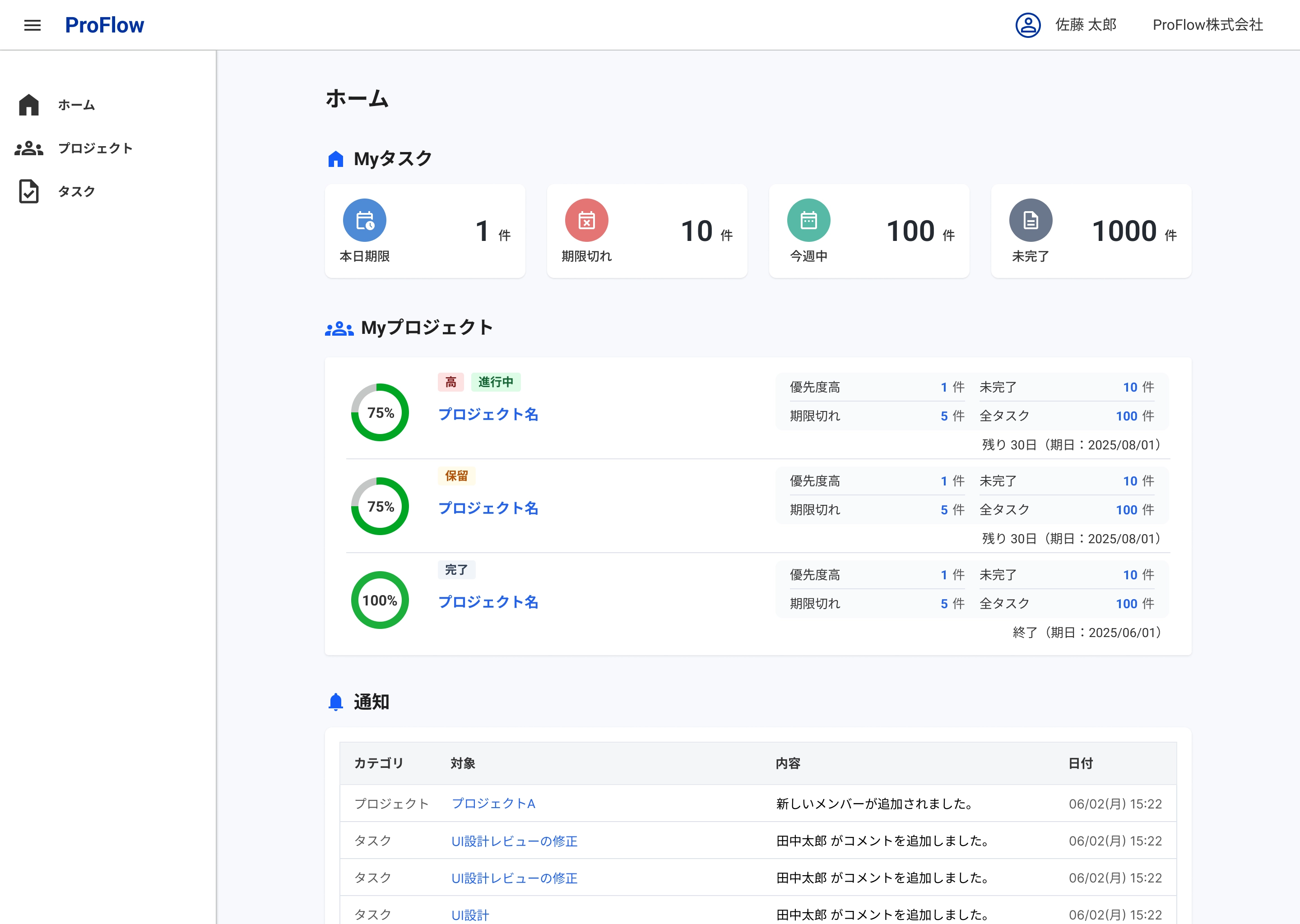 本日/期限切れ/今週のタスクを一覧で確認し、着手・完了・期日/優先度を更新。
