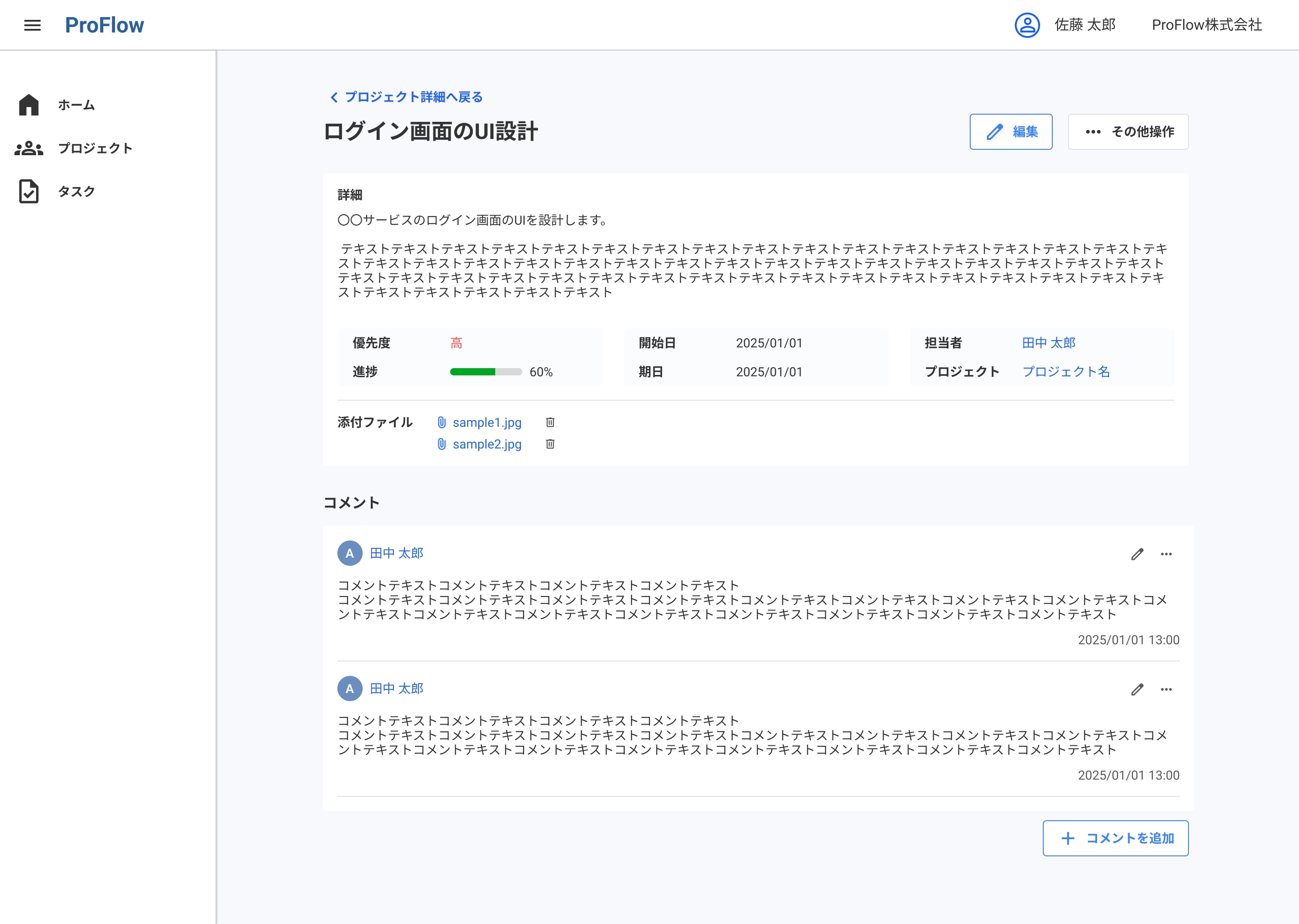 プロジェクト内でタスクを起票し、担当・期日・優先度・添付・コメントを設定。