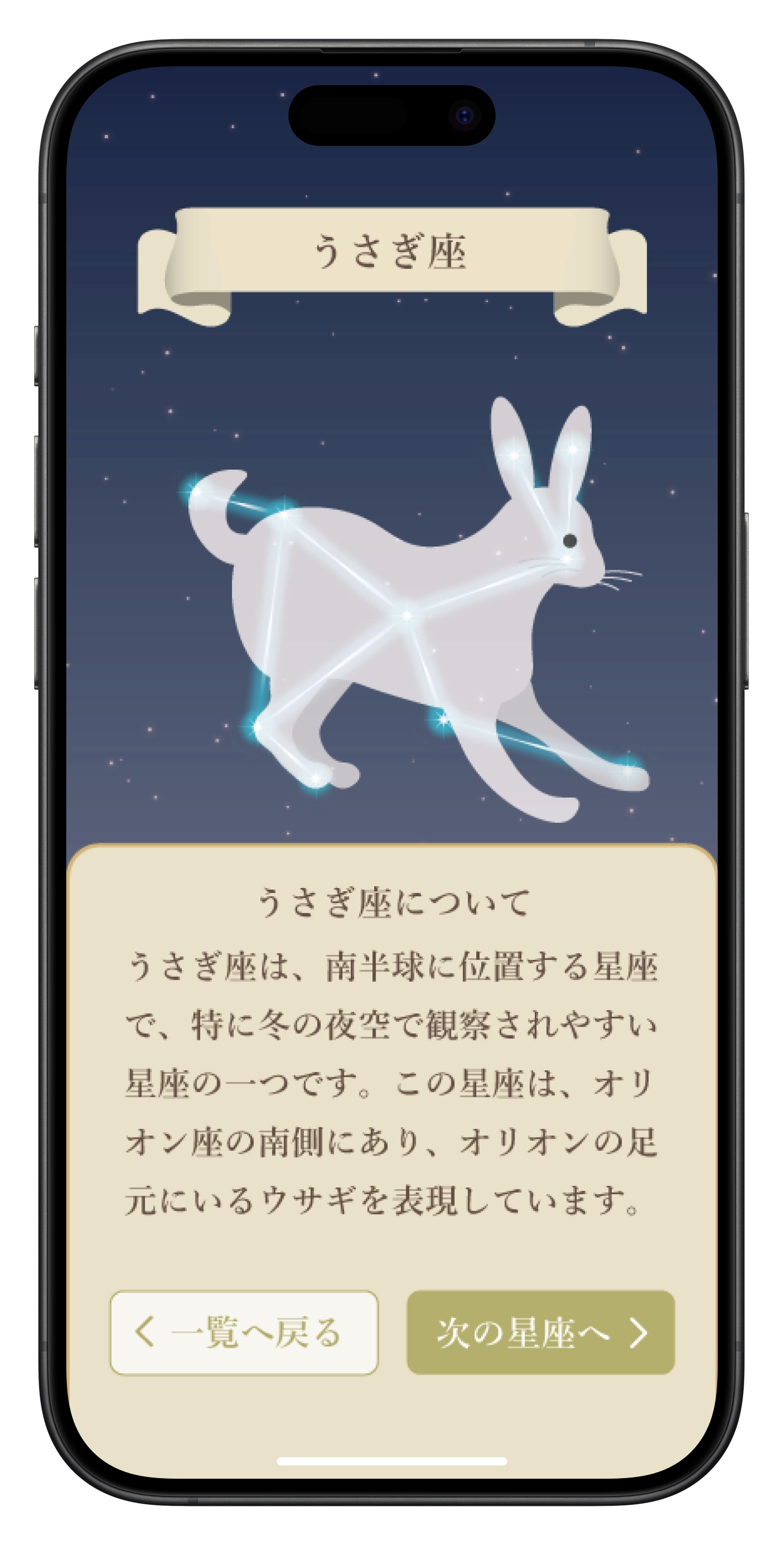 完成された星座は一覧に表示され、いつでもその星座の形や歴史を見ることができます。