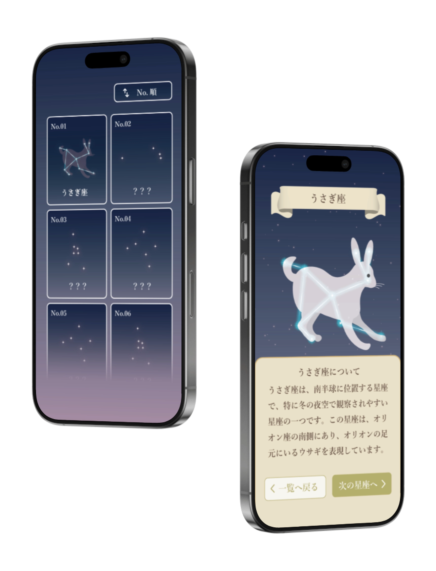 星空を見て「この星座なんだっけ?」となったときにこのアプリを思いだしてもらえるような、人の記憶に残るゲームを意識して制作しました。