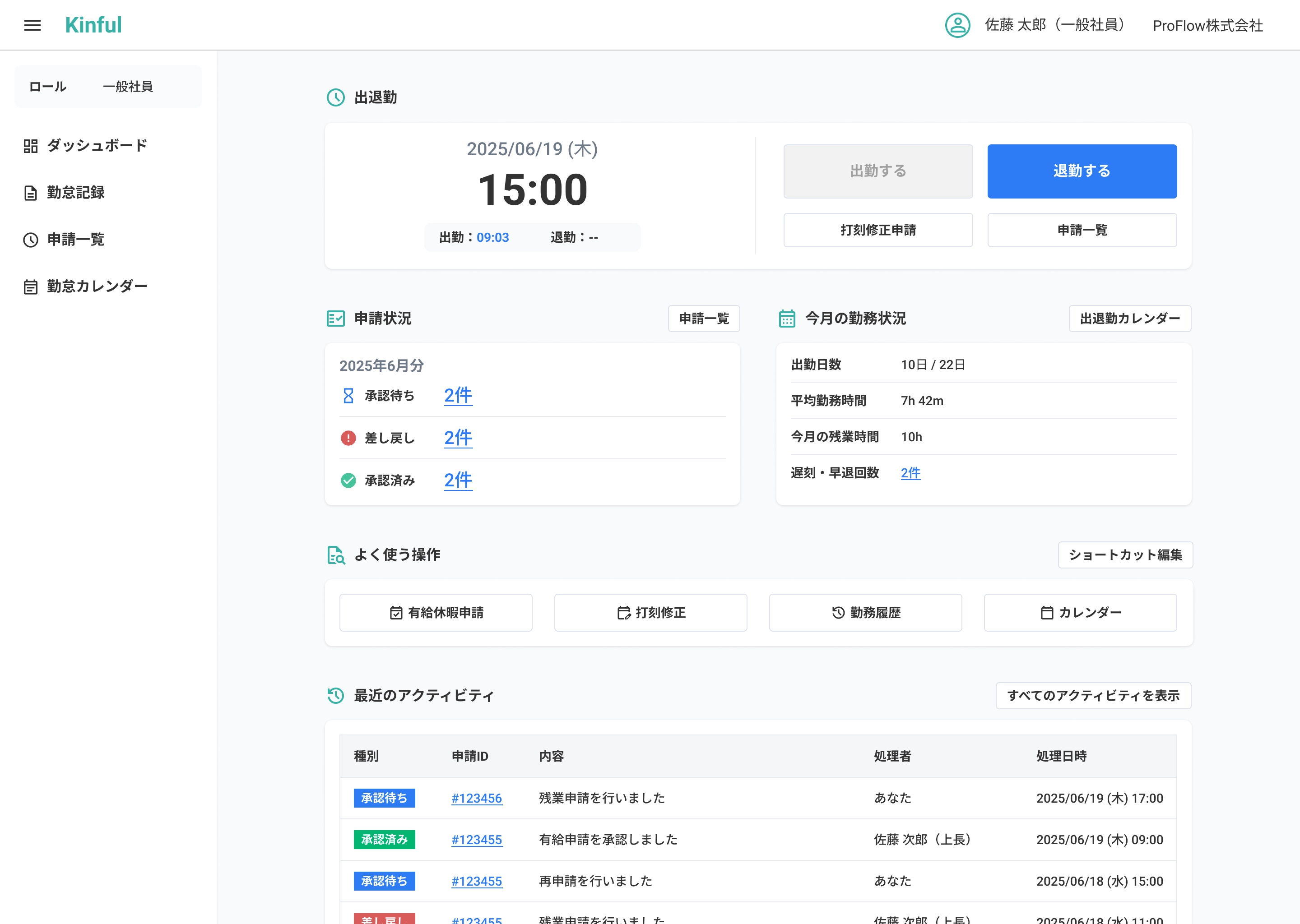 出退勤・申請状況・今月の実績を1画面に集約し、出勤/退勤・打刻修正・申請を最短導線で実行。