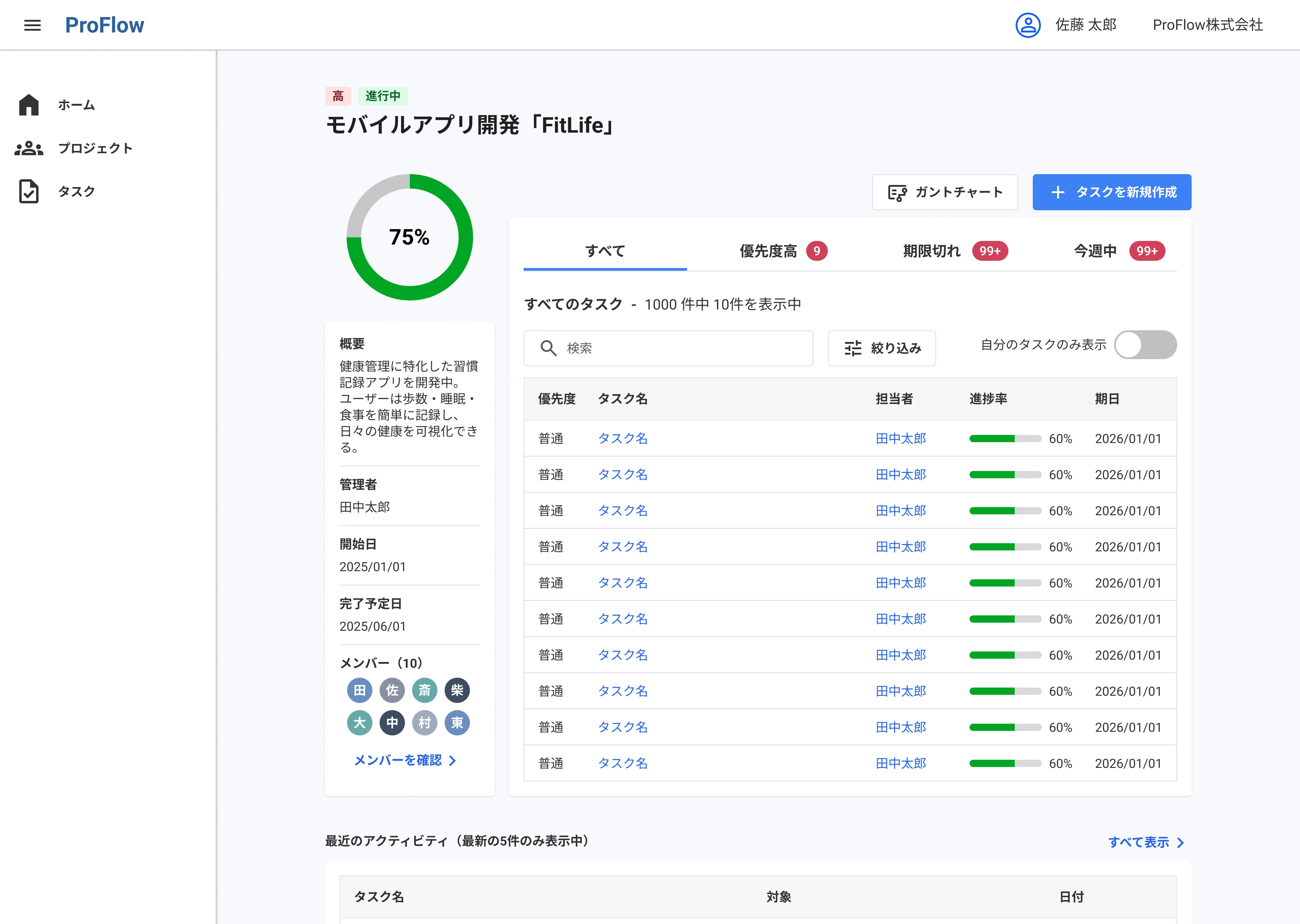 優先度/進捗/開始日/期限/担当/所属プロジェクトを冒頭に集約。