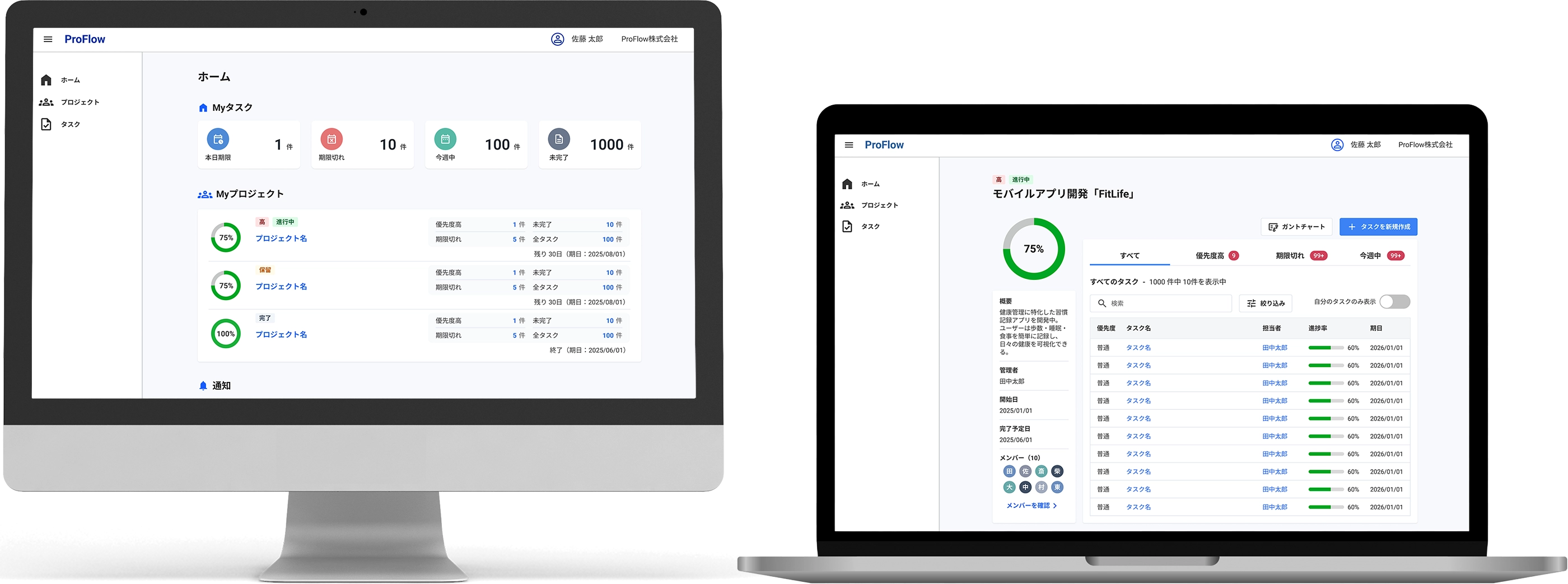 本日/期限切れ/今週のタスクを一覧で確認し、着手・完了・期日/優先度を更新。